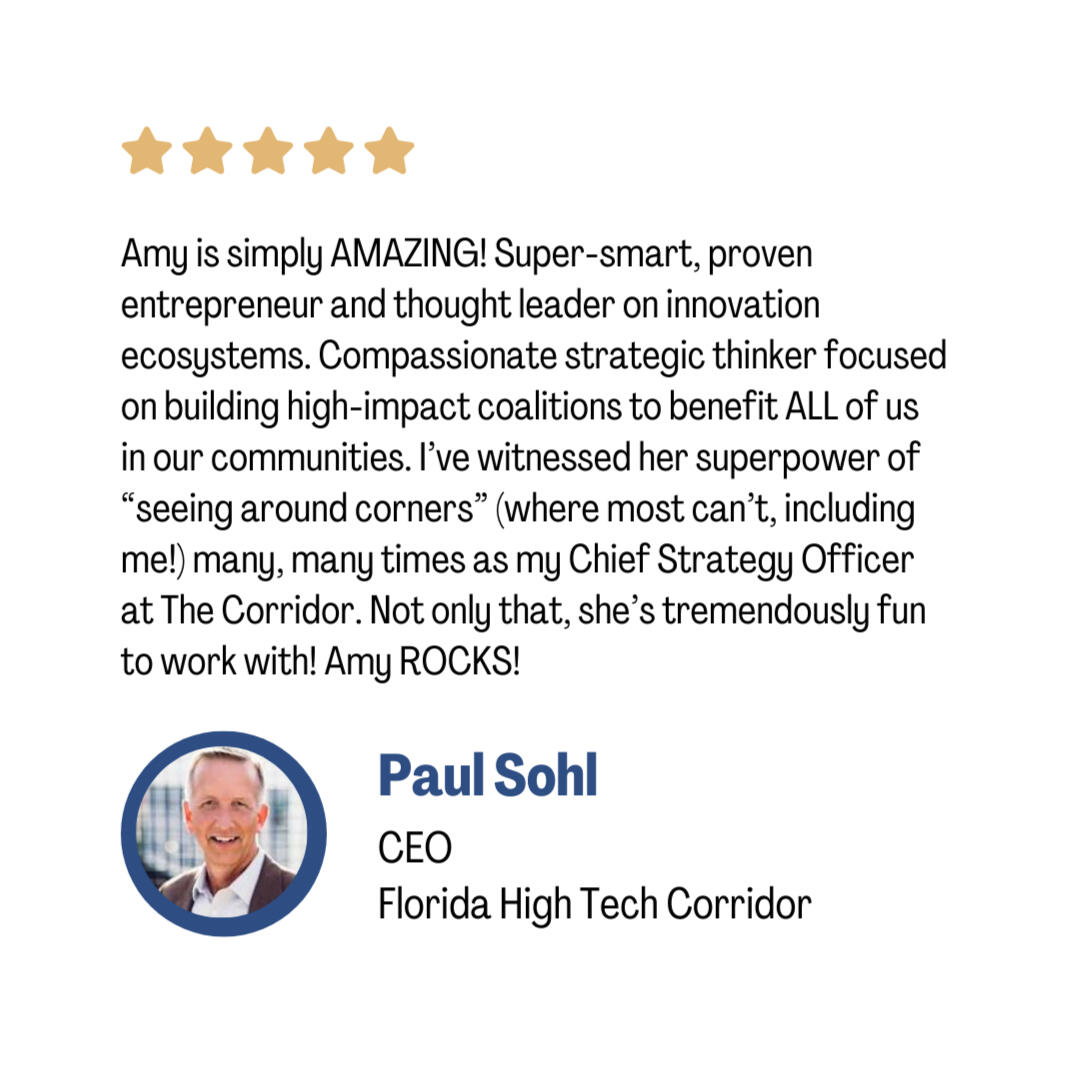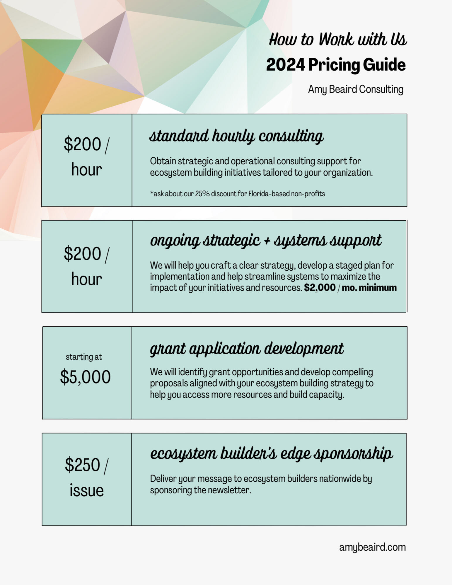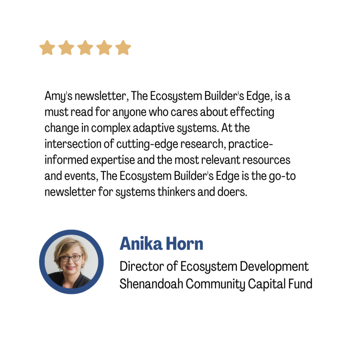 Hi–I’m Amy Beaird. I help innovation ecosystem builders strengthen their regions and their resolve.[ An open letter to innovation ecosystem builders]Navigating the innovation landscape is about embracing a purpose-driven journey.We approach our mission in a way that values collaboration, adaptability, and purposeful impact, and shared goals.The innovation ecosystem builder doesn't ask: “how can I gain?” They ask: “what kind of impact do I want to create?”, and then cultivates an ecosystem to amplify that impact.It’s not just about generating more solutions, revenue or jobs; it’s about fostering meaningful progress in our regions and communities.We cultivate dynamic and agile ecosystems — prioritizing interconnectedness and effective systems thinking to transform communities.Sometimes that means a hands-on approach, and often we leverage a network of specialists, collaborators, and partners to do collectively what none of us can do alone.At the end of the day, what unites us is a shared goal: Foster a culture that drives meaningful connections…and create a future where innovations abound.